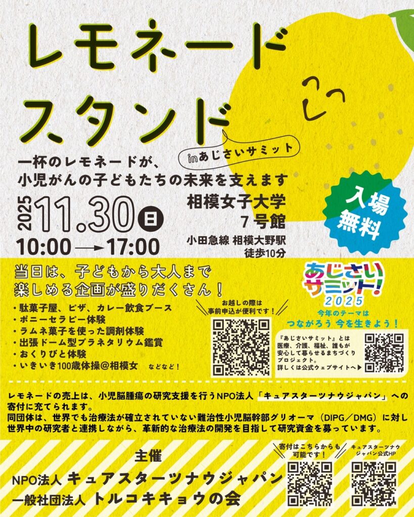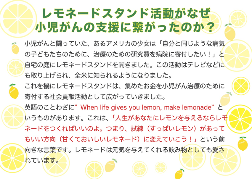レモネードの売上は、小児脳腫瘍の研究支援を行うNPO法人「キュアスターツナウジャパン」への寄付に充てられます。